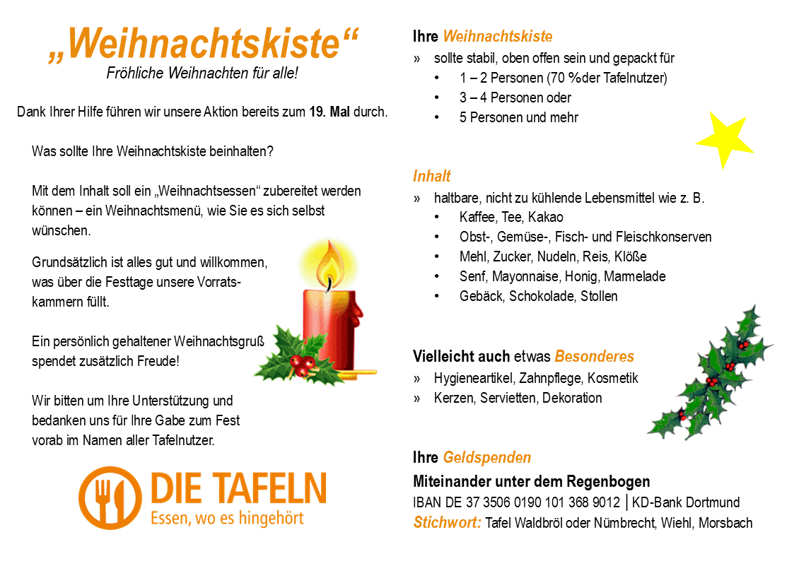 Am 09. Dezember 2025 sowie vom 22. Dezember 2025 bis einschließlich 02.Januar 2026 bleibt die Tafel Oberberg Süd geschlossen.