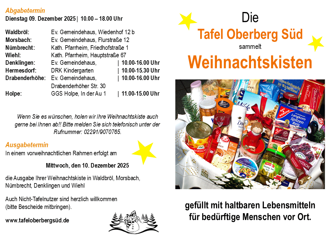 Am 09. Dezember 2025 sowie vom 22. Dezember 2025 bis einschließlich 02.Januar 2026 bleibt die Tafel Oberberg Süd geschlossen.